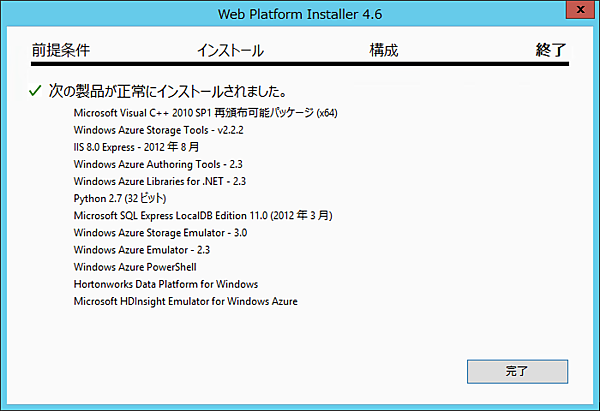 Windows Azure PowerShellと、Microsoft HDInsight Emulator for Windows Azureの二つを「追加」して「インストール」をクリックしてください。