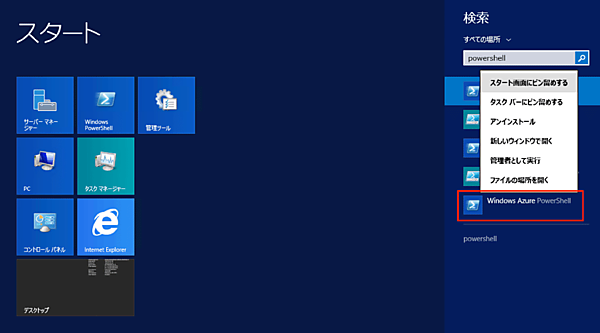 まず、Azure PowerShellを起動してください。デフォルトではスタート画面にはピン留めされていませんので、アプリ一覧画面からアイコンを探すか、スタート画面で「powreshell」で検索してください。そしてピン留めしてしまいましょう。