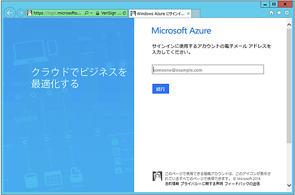 Get-AzurePublishSettingsFileすると、Azure管理ポータルのログオン画面が出てきますので、管理ポータルへのログオンに使用するユーザー名とパスワードを入力します。