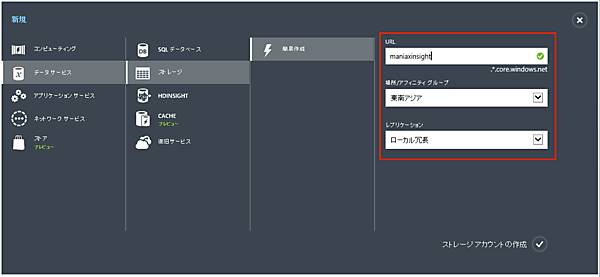 - 1. Azure管理ポータルで「新規」→「ストレージ」→「簡易作成」とクリックし、必要事項を記入します。