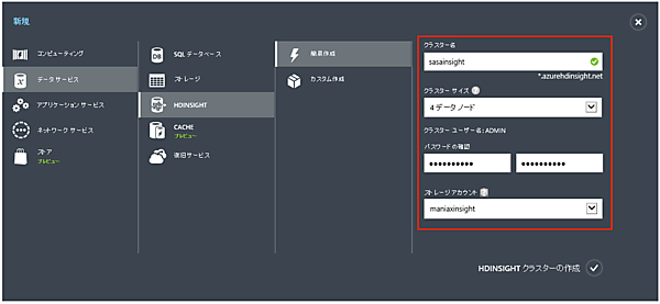 - 1. Azure管理ポータルで「新規」→「データサービス」→「HDINSIGHT」→「簡易作成」とクリックし、必要事項を記入します。