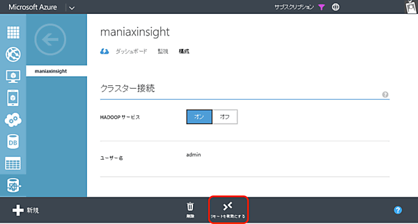 - 1. Azure管理ポータルでHDInsightクラスターを選択し、「構成」タブで「リモートを有効にする」をクリックします。