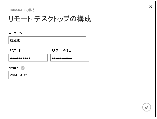 - 2. 「リモートデスクトップの構成」画面でユーザー名・パスワード・有効期限を設定します。なお、ここで指定する「ユーザー」は、クラスター作成時に指定する管理者とは別の「リモートデスクトップ接続専用のユーザー」です。