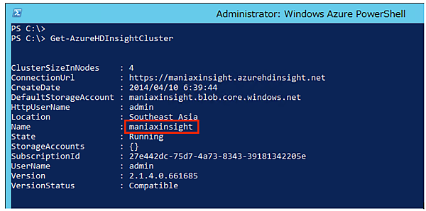 - 2. Get-AzureHDInsightClusterを実行して、先ほど作成した自分のHDInsightクラスターの名前を確認しておきましょう。