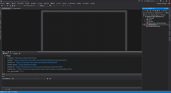 まず最初に、ソリューションエクスプローラー内のMainPage.xamlをダブルクリックしてデザイン画面を起動させることが、第一歩の始まりです。ソリューションエクスプローラーからMainPage.xamlをダブルクリックしたのが、図1の画面です。
