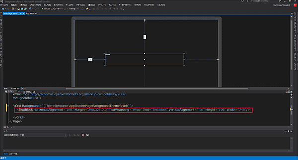 確かに表示はされました。しかし、文字があまりに小さく、なんと表示されているのか判別し辛いです。これはTextBlockコントロールに何のプロパティも設定していないために、このように表示されたのです。プロパティは、そのコントロールの見栄えを設定する際に使用します。この場合は、文字サイズをもっと大きく、文字色も目立つ色に、書体ももっとかっこいいものを選んだ方がいいでしょう。