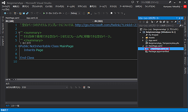図3 MainPage.xaml.vbをクリックしてコードエディタ画面を表示した(クリックで拡大)