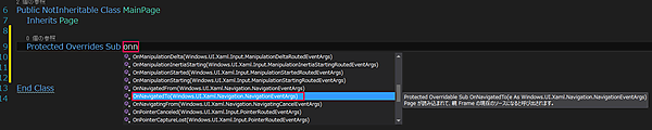 End Sub図3の7行目にあるInherits Pageの下に、「P」と入力するとインテリセンス機能が働き、「P」で始まるコードが表示されます。そこでProtectedを選択し、半角スペースを空けて「O」と入力すると、「O」で始まるコードの候補が表示されるので、Overridesを選択しましょう。次に半角空けてSubと入力し、最後に「onn」と入力して表示されるOnnavigatedToを選択します(図4)。