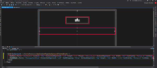 <Button x:Name="startButton" Content="表示" HorizontalAlignment="Left" Height="115" Margin="482,116,0,0" VerticalAlignment="Top" Width="407" FontFamily="Meiryo UI" FontSize="48"/>