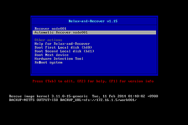 作成したisoイメージを使って、リストア対象ノードをCDブートさせてリストアを行います。DVDドライブが装着されていないProLiantサーバーの場合は、オンボードに搭載されたiLO4チップの仮想DVDドライブ機能を利用することで、物理DVDドライブがなくてもCDブートが可能です。CDブートを行うと、下図のようなReaRのブートメニュー画面が表示されます。