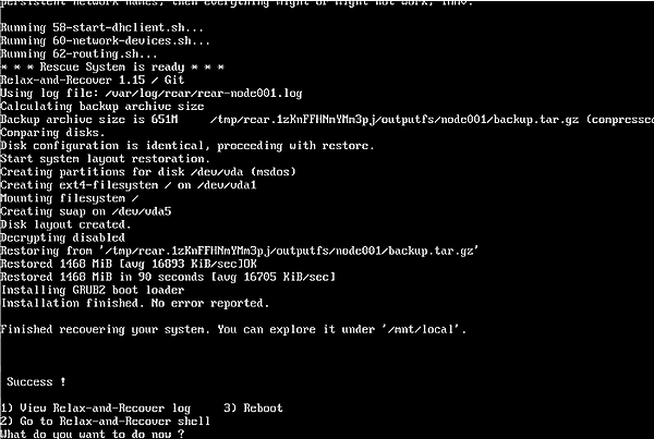 「Automatic Recover」を選択するとリストアが実行されます。リストアが成功すると画面に「Success!」と表示されます。対象ノードを再起動させるため、「3」を入力します。