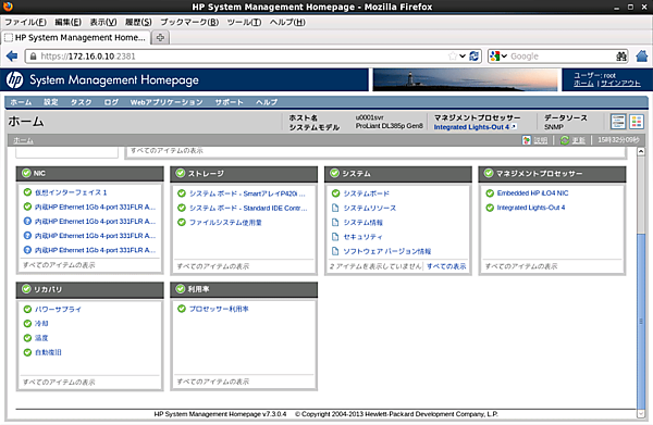 # /sbin/hpsnmpconfighpsnmpconfigコマンドによるSNMP設定が終了したら、Ubuntu Serverを再起動します。Ubuntu Serverを再起動後、監視対象サーバーで提供されるSystem Management Homepage(通称SMH)にWebブラウザーでアクセスすることで監視することが可能です。