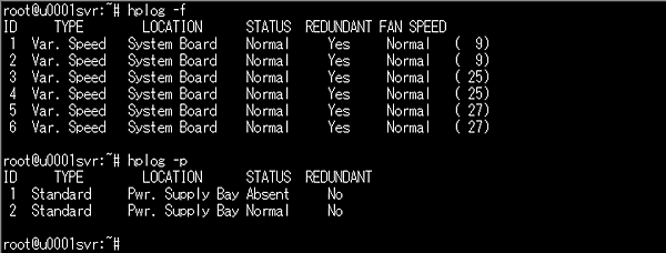 監視エージェントを入れるメリットに、詳細な監視データをコマンドラインから取得できるという点があります。MCPに同梱されているUbuntu Server向けの管理ユーティリティの1つであるhplogコマンドは、サーバーの温度、ファン、電源の状態をCLIの標準出力に表示することが可能です。