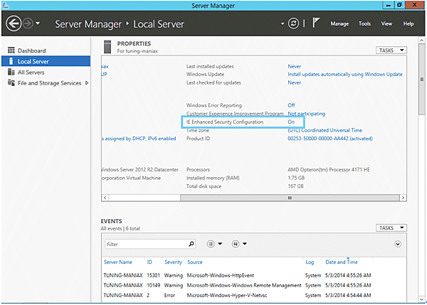リモートデスクトップ接続した仮想マシンで、[ Server Manager ]の左側にある[ Local Server ]をクリックして、[ IE Enhanced Security Configuration ]の[ On ]をクリックします。