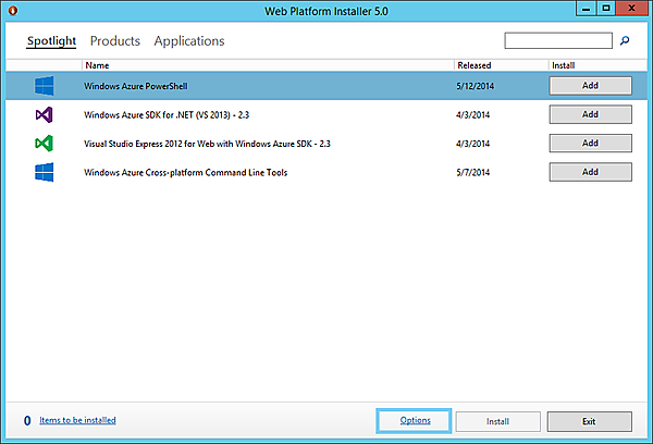 ダウンロードした wpilauncher.exe を実行すると、自動的に Web PI が起動してきます。Web PI の起動が完了したら下にある[ Options ]をクリックします。