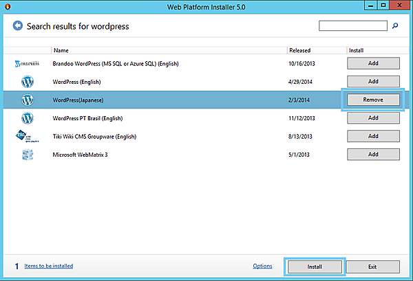 この設定でWordPress の日本語版を Web PI からインストールすることが可能になりました。Web PI の画面右上にある検索ボックスに [ wordpress ] と入力して、検索結果から[ WordPress(Japanese) ]の右側にある[ Add ]ボタンをクリックし、[ Install ]ボタンをクリックします。