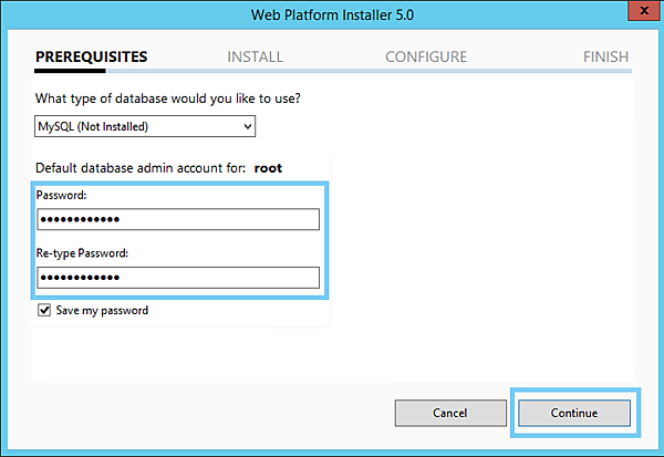 MySQL の root アカウントのパスワードを入力して、[ Continue ]ボタンをクリックします。