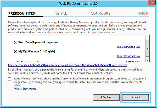 WordPress をインストールするのに必要なコンポーネントなどが自動的にリストアップされます。必要に応じてリストを確認して、[ I Accept ]ボタンをクリックします。