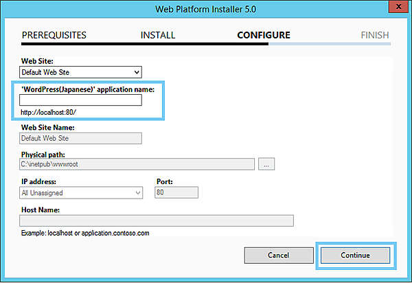 続いて IIS のWebサイトの基本設定を行います。[ ‘WordPress(Japanese)’ application name ]に入力されている[ wordpress ]の文字を削除して[ Continue ]ボタンをクリックすると、上書きの確認メッセージが表示されますので、[ Yes ]ボタンをクリックします。