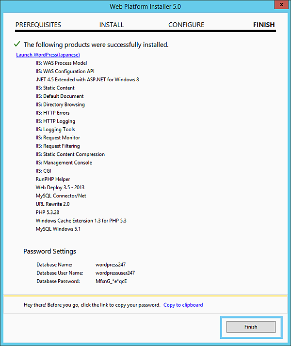 右下の[ Finish ]ボタンをクリックすると、自動的にIEが起動して Web PI で作成された WordPress のサイトが表示されます。しかし、ここで起動してきたブラウザから WordPress のインストールは実行しないでください。