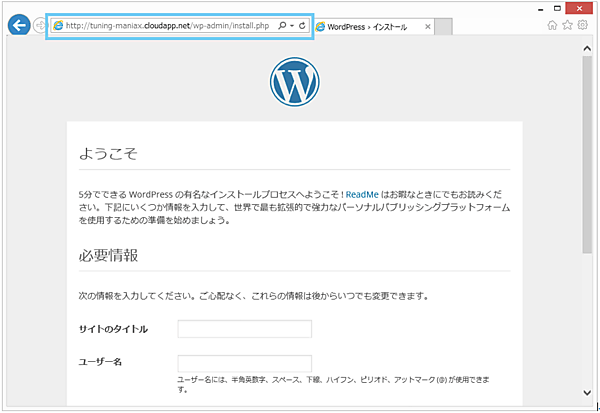 リモートデスクトップ接続内からではなく、仮想マシンを作成したときに設定したDNS名[ http://tuning-maniax.cloudapp.net ]のURLで、必ずインターネット越しにサイトにアクセスして WordPress をインストールしてください。