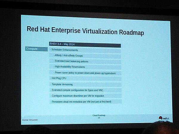 Red Hat社が提供している仮想化基盤ソフトウェア「Red Hat Enterprise Virtualization(通称RHEV)」のロードマップが紹介されました。RHEV3.4では、複数の種類のストレージドメインやOpenStackのCinderによるブロック・ストレージのサポート、ホットプラグCPU、スナップショット機能、RHEVハイパーバイザー(通称RHEV-H)におけるiSCSI接続のマルチパス構成のサポート等が検討されています。これにより、RHEVは、複数ストレージの同時利用に関するシステム構成の柔軟性の向上と利便性の向上が期待できます。