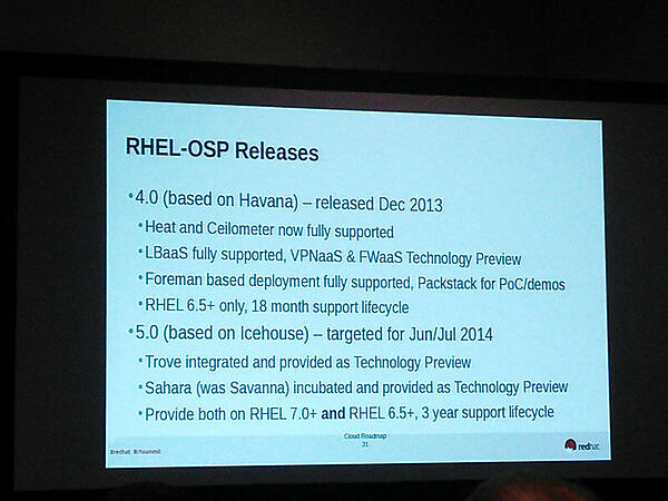 Red Hat社が提供するIaaS基盤「Red Hat Enterprise Linux OpenStack Platform(通称RHELOSP)」のロードマップが紹介されました。IcehouseベースのRHELOSP 5.0のHAクラスター構成に関する基本的な考え方もブレークアウト・セッションにて示されました。