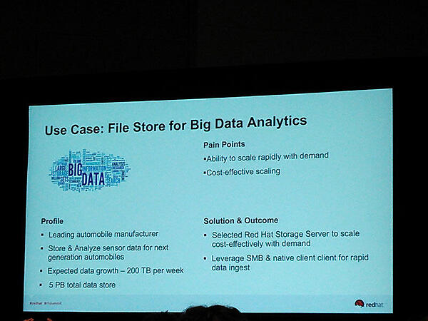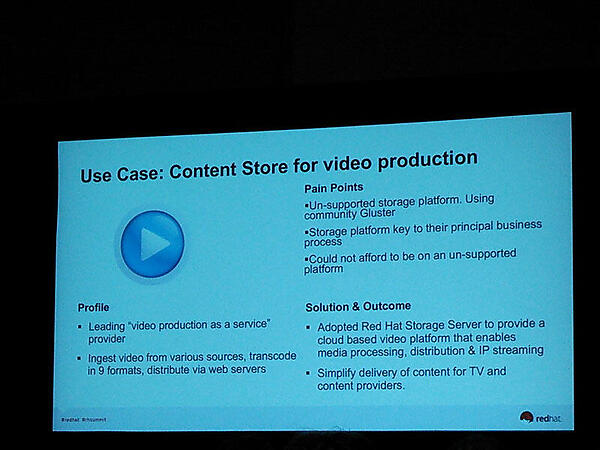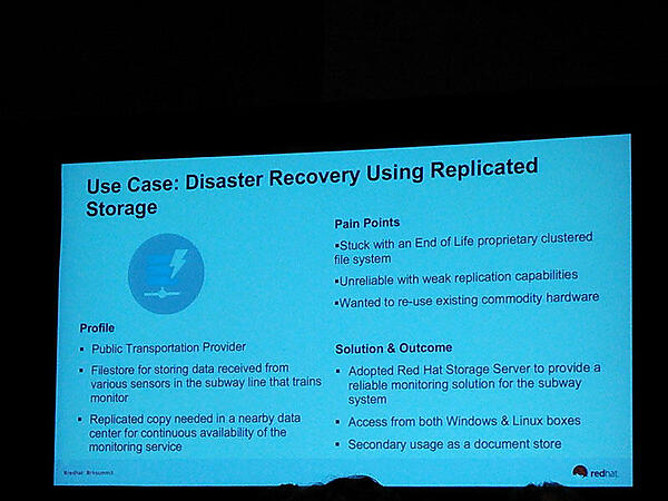 自動車会社、映像関連企業、公共交通機関における分散ストレージ基盤ソフトウェア「Red Hat Storage」の事例が紹介されました。Red Hat Storageは、x86サーバーを大量に並べて一つの大きなストレージ基盤を構成するためのソフトウェアですが、すでにペタバイト級の本番システムで利用されていることがわかります。