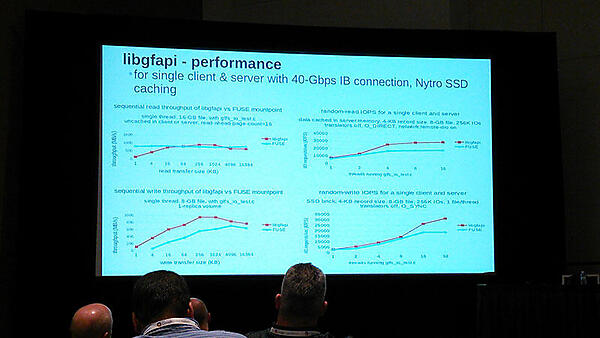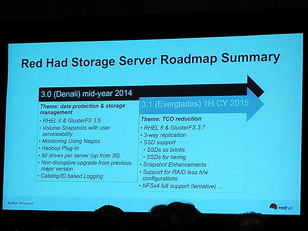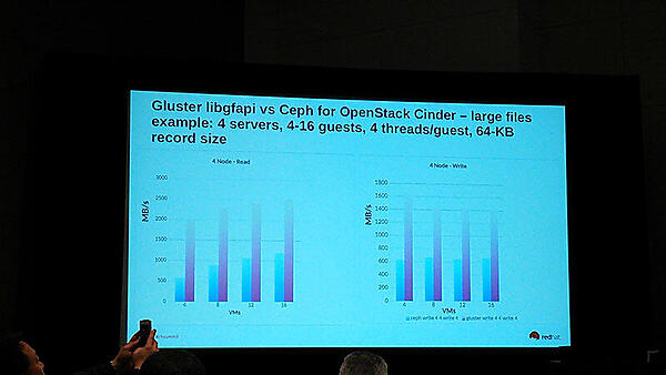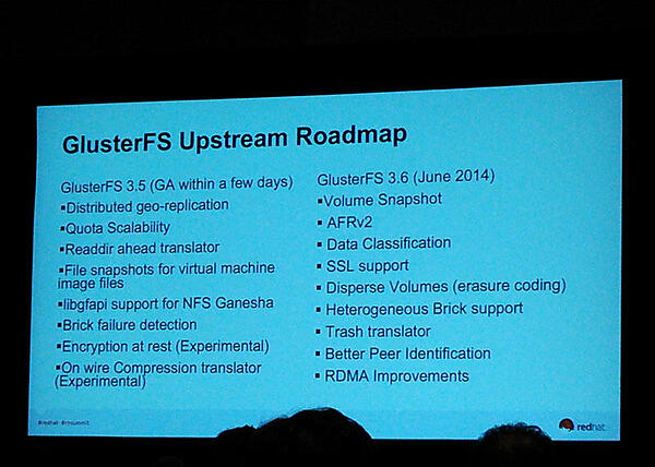 Red Hat StorageのベースとなるGlusterFS、OpenStack対応のロードマップが示されました。Red Hat Storageユーザーの待望の機能であるスナップショットの採用が紹介されました。スナップショットはLVM2の技術が利用されています。また、Red Hat Storage、Ceph、Cinder、Swiftの様々な性能評価がRed Hatの技術者によって行われていることが紹介されました。クラウド基盤との連携については、OpenStack CinderやSwiftストレージ基盤にRed Hat Storageを対応させる取り組みが行われていることが示されました。