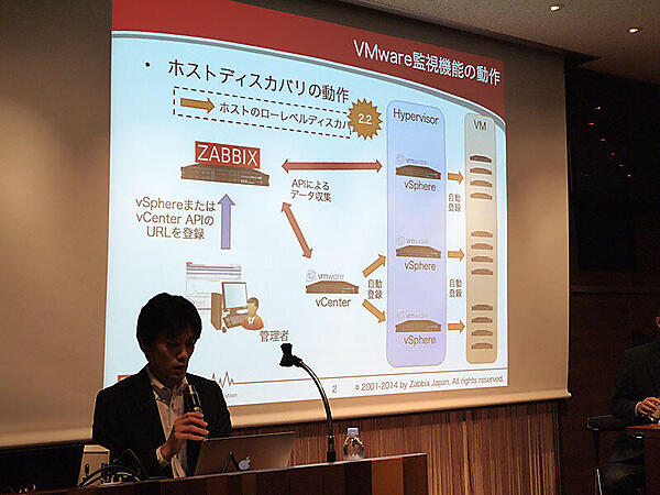 Zabbix Japan 寺島広大氏(以下、寺島氏):Zabbix Japanの寺島と申します。かなり前からZabbixを使っていて、(ラトビアの)本社で1、2年働いた後、日本で支社であるZabbix Japanを設立しました。現在国内ユーザーとパートナーに向けて支援を行っています。仮想環境に関しては2.2で新しく追加された機能について、自分自身で開発に関わっている部分もあるので、細かいところ含めて話をしていきたいと思います。