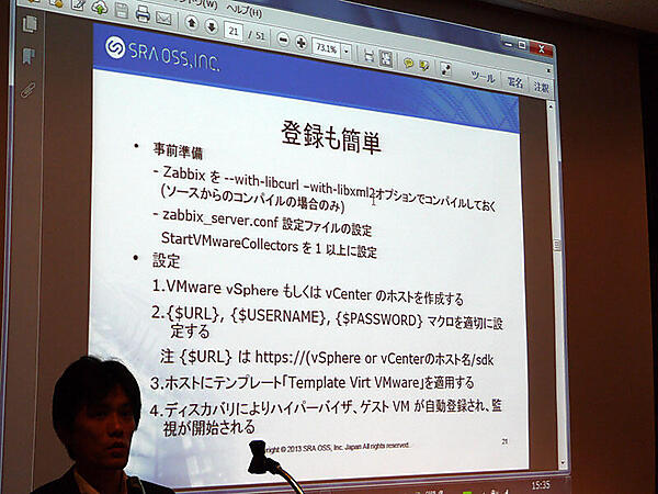 寺島氏:直接名前を出すのが難しいのですが、日本を含む世界において、大規模、VMware環境での実績が出てきています。例えば、Zabbix Japanのサイトにある、昨年開催されたカンファレンスのページでは、Niftyさんが実際にVMwareの仮想環境を使って監視を行ったテスト内容が紹介されています。1000VM追加した際のパフォーマンスデータなど、2.2のリリース直後から積極的にテストに参加して頂いています。