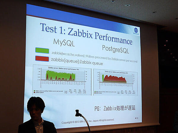 寺田氏:エンタープライズのユーザーや数万台という大規模環境のお話から。SRA OSSさんのホームページで拝見したのですが、ZabbixのデータベースとしてMySQLやPostgreSQLを盛さんが比較したページがあったのですが、その辺りについて紹介していただけますか。