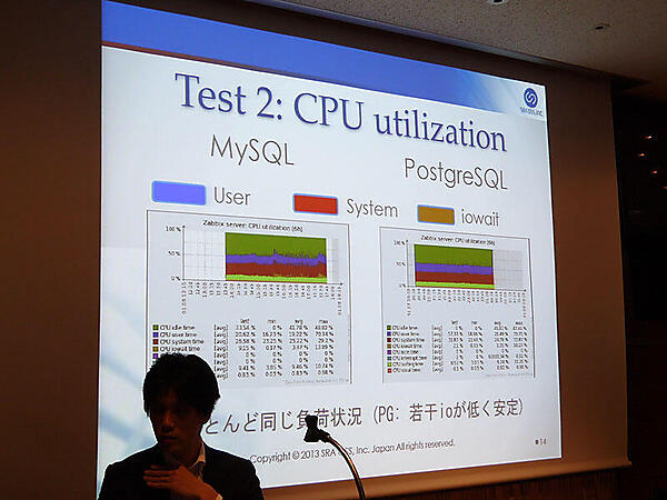 Zabbixを運用していると、データベースのアクセスがどんどん多くなってしまうために、I/O waitが多発する傾向にあります。CPU利用率を見たところ、ほとんど同じ負荷状況なものの、PostgreSQLではI/O waitがほとんど出ないことが確認できました。