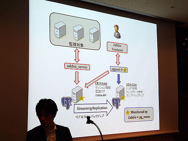 ZabbixのWeb画面というのは、アクセスするとセッション情報などの書き込みを行ったり、認証ログを残したりするなど、絶対に書き込みが入ってしまいます。PostgreSQLのストリーミング・レプリケーションを使うことによって、マスターサーバーに負荷をかけることなく、より多くの監視ができるのではと注目しています。