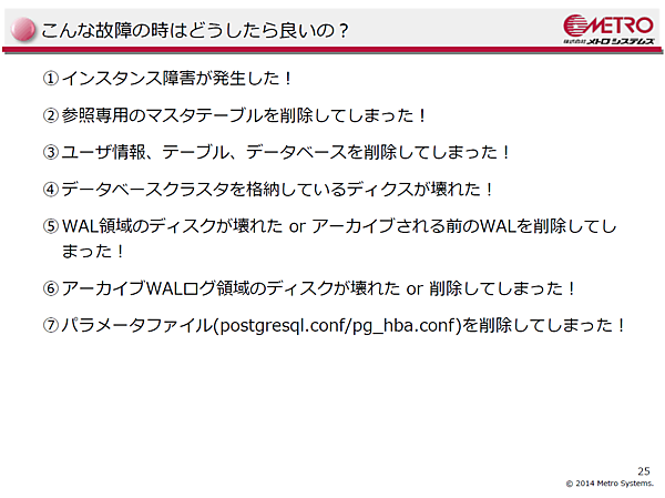 また、テーブルやデータベースを削除してしまった等、具体的な故障や操作ミスのケースを想定して、どのように対処すればよいかの解説がされました。