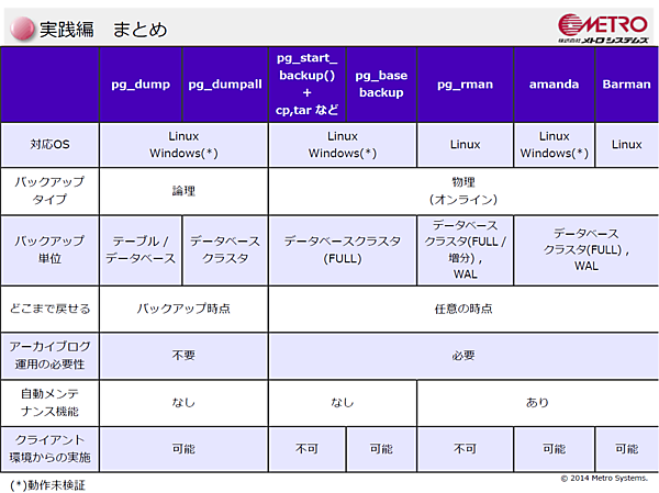 ここでは一般的によく使われているPostgreSQL標準ツールのpg_dump、ベースバックアップの取得方法から、あまり知られていないツールであるpg_rman、amanda、barmanといったものまで紹介されました。特にamanda、barmanは海外で開発されたツールで日本語の情報もあまりないことから、非常に貴重な内容でした。