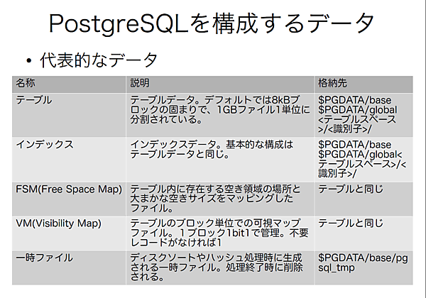 最初にテーブル、ログ、ファイルのそれぞれの名称と説明と格納先が紹介されました。PostgreSQLが扱うデータは、データベースクラスタ内で管理されており、その中は様々な役割を担うファイルが格納されていることがわかります。