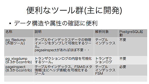 最後は笠原氏によるPostgreSQLのデータ構造やその内部を知るための有用なツールについての解説でした。