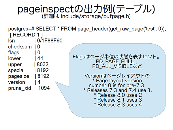 例えば、テーブルやインデックスのページ構造を調べるツールpageinspectは、手軽に以下のような形でテーブルの状態を出力できるとのことでした。
