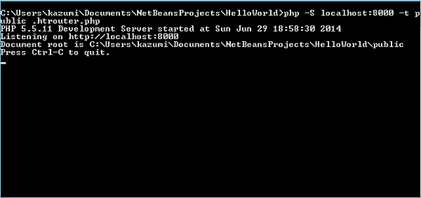 C:\Users\kazumi\Documents\NetBeansProjects\HelloWorld>php -S localhost:8000 -t public .htrouter.php