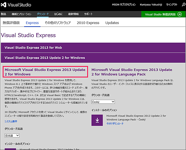 Express版にはいろいろなエディションが用意されていますが、今回ダウンロードするのは、「Visual Studio 2013 Update 2 for Windows」です(図2)。