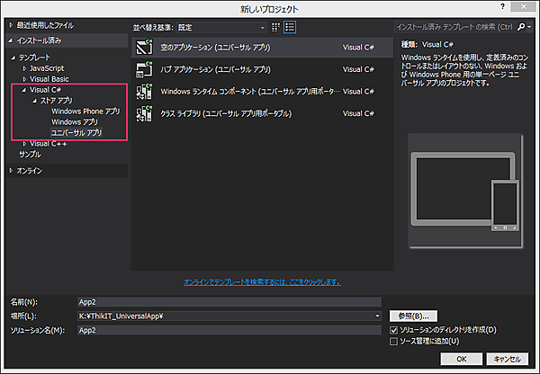 Visual Studio 2013 Update2 RTM版を適用すると、VS2013に「ユニバーサルアプリ」のテンプレートが表示されます(図3)。