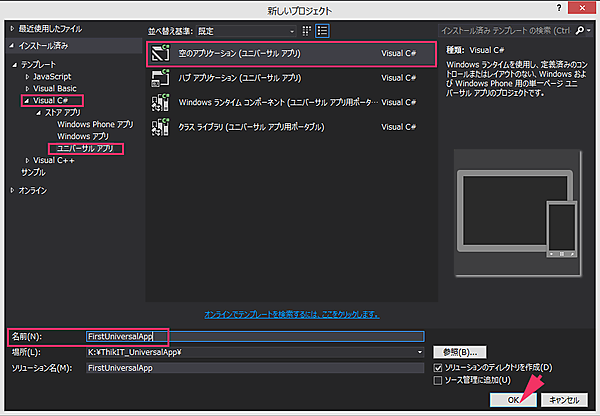 次に、画面中央に表示されるテンプレートから「空のアプリケーション(ユニバーサルアプリ)」を選択します。「名前」には「FirstUniversalApp」と指定し、「場所」には適当なフォルダーを指定します(図5)。