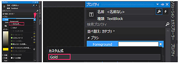 TextBlock1ではプロパティの「ブラシ」ペインにある「Foreground」で文字色に「Gold」を指定しています。「Foreground」の右にある小さな■をクリックすると、「カスタム式」のメニューが表示されますので、それをクリックして、表示される入力ボックスに「Gold」と入力します。これで、TextBlock1の文字色が「Gold」になります(図8)。