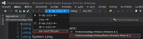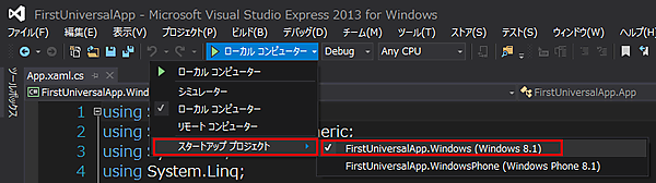 これで、実行してみましょう。VS2013メニューの「ローカルコンピューター」と表示されている中から、「スタートアッププロジェクト」を選択し、「FirstUniversalApp.Windows(Windows 8.1)」を選択します(図13)。
