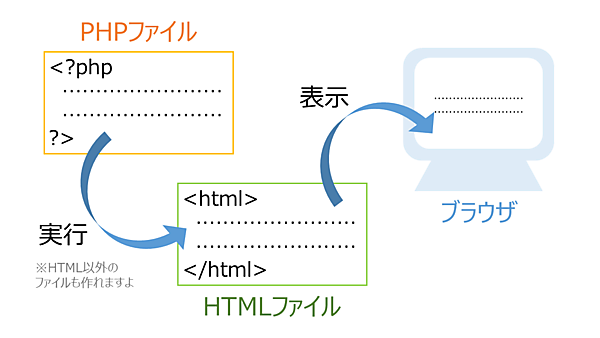 PHPのコードは開始タグと終了タグの間に書きます(※)。それ以外の場所に書いたものは、PHPのコードとしてコンピュータに実行してもらえずに、書いたものがそのままになります。ウェブページならば、そのままHTMLとしてブラウザに判断されます。
