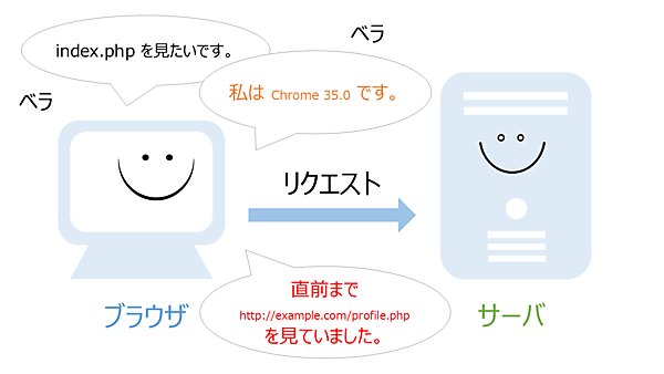次は画面を見ている人の情報を出力してみましょう。ブラウザはサーバーにリクエストを送る際、普通の人が想像している以上の情報を一緒に送っています。