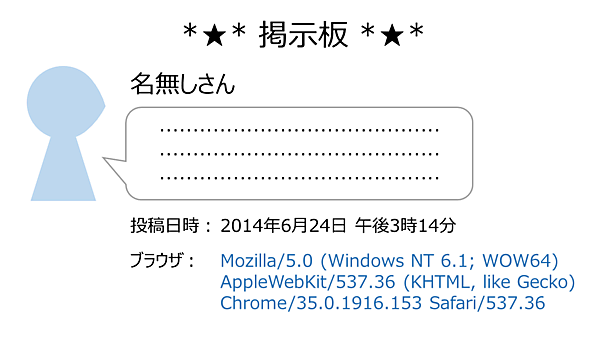 実は、上の例は悪い例なのです。ブラウザから送られてきた情報は、そのまま使っては絶対にいけません。少し技術に詳しい人なら誰でも、これらの情報を悪いように書き換えることができるからです。例えば掲示板を想像してみてください。入力されたコメントの他に、その人が使っているブラウザの情報を自動で登録するとします。ブラウザから送られてきた情報をそのまま登録して表示すると、このようになりますね。
