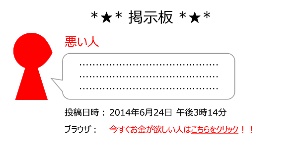 しかしもし、ブラウザの情報がいかがわしいサイトへのリンクにすり替えられていたらどうでしょう。ブラウザの情報の代わりにいかがわしいリンクが登録されてしまい、画面を見た別の人が、そのリンクをクリックしてしまうかもしれません!掲示板を作った人は悪いことをするつもりがないのに、悪意のある第三者に利用されてしまうのです。