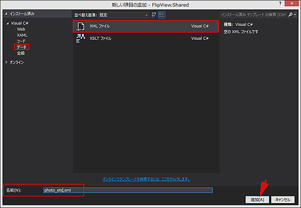 すると、図1のように「新しい項目の追加」画面が表示されますので、左から「データ」を選択し、表示されるテンプレートから「XMLファイル」を選択します。「名前」には「photo_etc.xml」と指定して[追加]ボタンをクリックします。